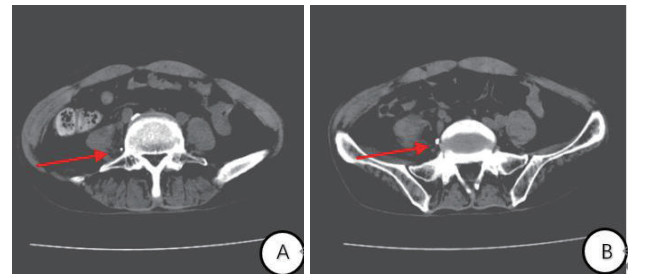 图 2 腹部CT横断面(A, B)股静脉导管尖位置 |