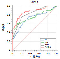 RPR、CAR、BISAP评分单独及三者联合时预测非MAP和SAP的结果均显示,三者联合时对AP病情程度的预测价值优于单一指标。见表 6、图 1和图 2。