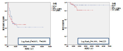 HFNC组治疗失败率为52.2%,NIV组为48.9%,两组差异无统计学意义(P=0.754),HFNC组中有4例(8.7%)病情恶化后尝试NIV,其中3例仍未缓解最终行气管插管有创通气治疗。两组间各失败原因以及其他次要结局方面差异无统计学意义(均P>0.05),见表 3。生存曲线比较显示两组间插管率及病死率差异无统计学意义(P=0.910,0.223),见图 1。