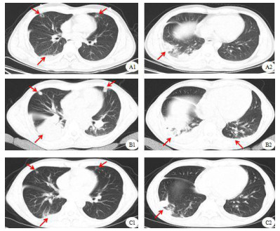 | 图A1、A2为12月16日(入院时)胸部CT:双肺多发小脓肿,右侧叶间裂积液,右侧胸腔积液;图B1、B2为1月6日胸部CT:双肺渗出较前加重,右侧包裹性胸腔积液;图C1、C2为1月25日(出院时)胸部CT:肺部感染明显吸收;病变如箭头所示 图 1 患者胸部CT图像 |