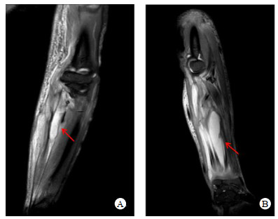 | A图:右侧前臂T2WI;B图:左侧前臂T2WI肌间隙多发长条高信号,结合DWI高信号、ADC值减低,考虑脓肿;病变如箭头所示 图 2 患者肌肉核磁图像 |