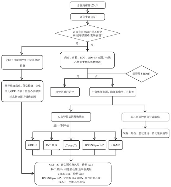 在所有急诊接诊的患者中,如果存在急性胸痛的危险因素及发病特征,需迅速进行GDF-15及传统心血管生物标志物的联合检测,并根据不同检测结果,进入相应诊断路径(图 1)。