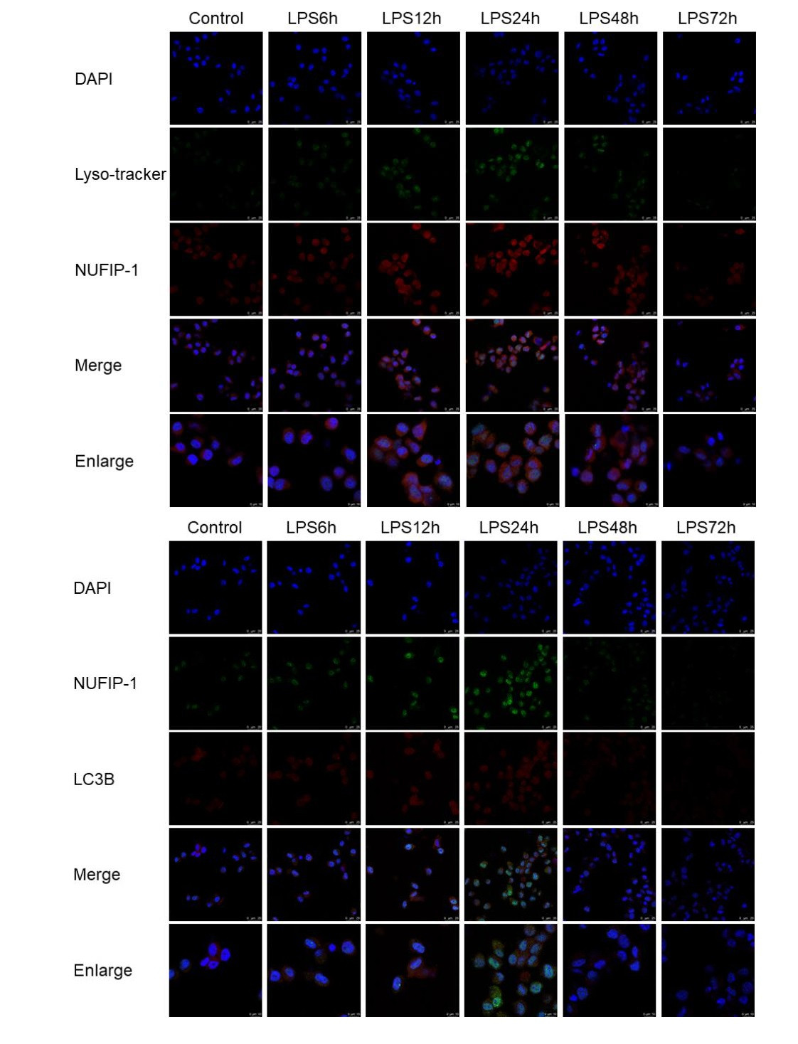 激光共聚焦显微镜显示,DC2.4中NUFIP-1主要定位于细胞核及核周,LPS刺激后NUFIP-1荧光强度于6~24 h呈时间依赖性增强,而刺激48及72 h显著减弱。其中,LPS 24 h组其表达较空白对照组明显增强。同时,NUFIP-1与Lyso-tracker和LC3B的共定位在LPS刺激下逐渐增强,于LPS刺激24 h后达峰值,其在LPS 48及LPS 72 h组显著减弱,见图 2。