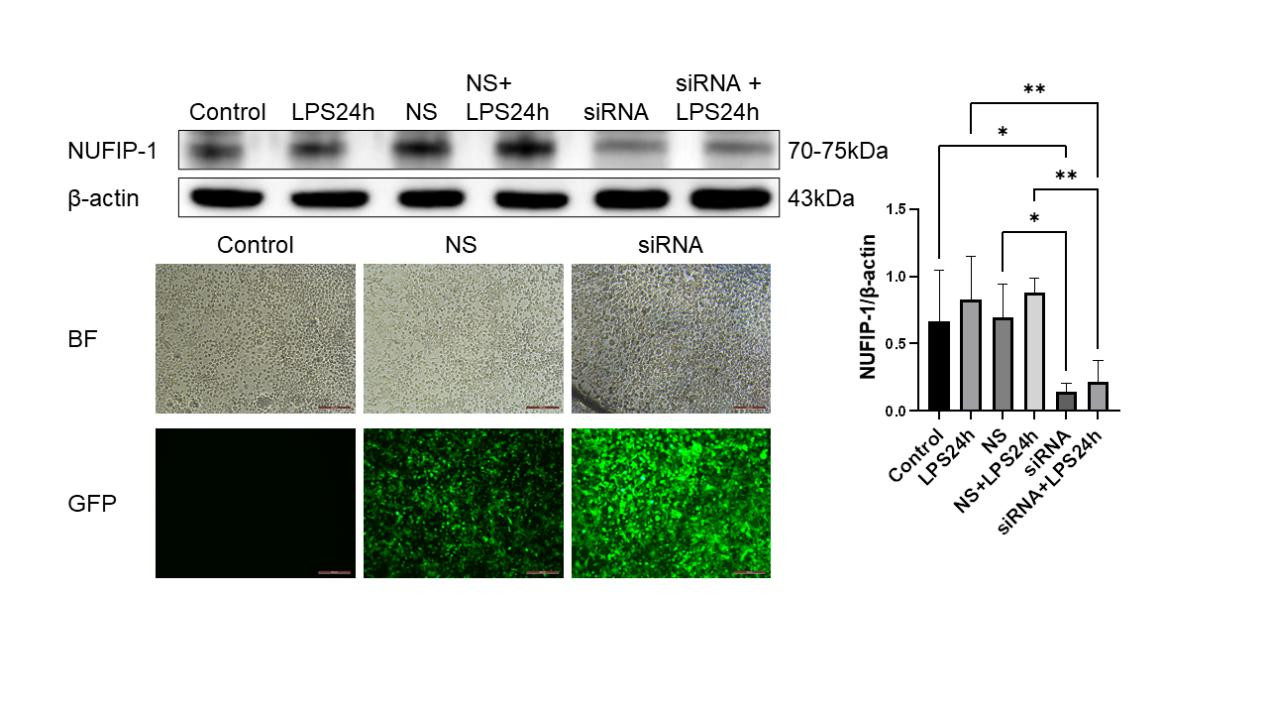 1.2 细胞培养及分组DC2.4培养于T25孔板,加入6~8 mL含15%胎牛血清(FBS)的RPMI 1640完全培养基中,置于37℃、5%CO2培养箱中,细胞正常生长,每1~2 d进行换液,长至细胞汇合度约为80%时进行传代。实验一:DC2.4复苏后培养并传代,得到足够细胞后进行分组,包括空白对照组及LPS刺激组,LPS刺激组给予1 μg/mL LPS分别处理6、12、24、48、72 h(n=5);实验二:将细胞分为空白对照组(Control组)、空白对照LPS(1 μg/mL)刺激组(LPS组),空载体组(NS组)、空载体LPS(1 μg/mL)刺激组(NS+LPS组)、沉默病毒组(siRNA组)、沉默病毒LPS (1 μg/mL)刺激组(siRNA+LPS组),LPS刺激组给予1 μg/mL LPS刺激24 h(n=3)。实验一用于NUFIP-1表达及核糖体自噬检测,实验二用于转染NUFIP-1沉默病毒和阴性对照病毒后细胞凋亡的检测。
