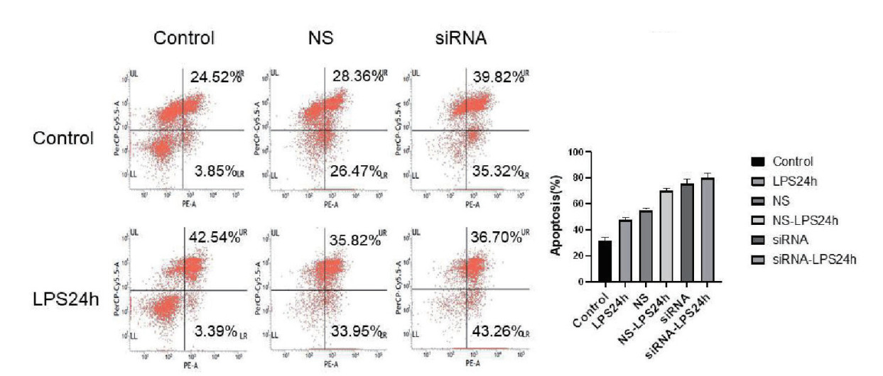 流式细胞学结果显示,NUFIP-1 siRNA感染组在LPS刺激24 h后较空白对照LPS 24 h组和空载体LPS 24 h组DC2.4凋亡率显著升高[空白对照LPS 24 h组:(47.91% ± 1.006%);空载体LPS 24 h组:(70.26% ± 1.011%);siRNA LPS 24 h组:(80.23% ± 2.094%),P < 0.01],见图 4。