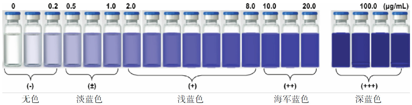 百草枯定量检测可采用高效液相色谱法、高效液相色谱-质谱联用等方法,这些方法精密度好、敏感度及准确度高,而被越来越广泛地使用[35-36]。在缺乏定量检测设备的地区,可采用碳酸氢钠-连二亚硫酸钠定性及半定量检测方法,简单易行,成本较低,适宜于急诊抢救和基层单位,但敏感度与精确度较低,检测限也较高,对于极微量样品定量存在困难,具体方法:留取患者尿液10 mL,加入现配的碳酸氢钠溶液(100 mg/2 mL)与连二亚硫酸钠粉末(50 mg)的混合液(连二亚硫酸钠属于强还原剂,要远离火源,避免潮湿,操作者注意个人安全防护),混匀后对比半定量比色卡(见图 1)。