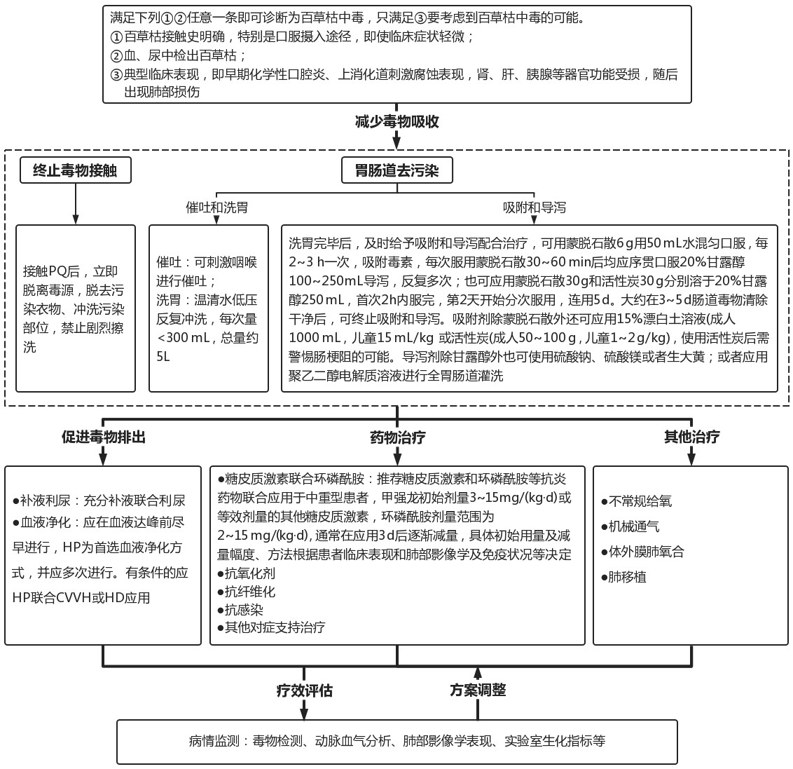 推荐意见1:对诊断百草枯中毒患者要立即行血和尿百草枯检测并对检测方法客观评估,之后酌情检测频次,指导诊治,直至血和尿百草枯检测结果阴性。(证据等级Ⅰ,推荐强度A)