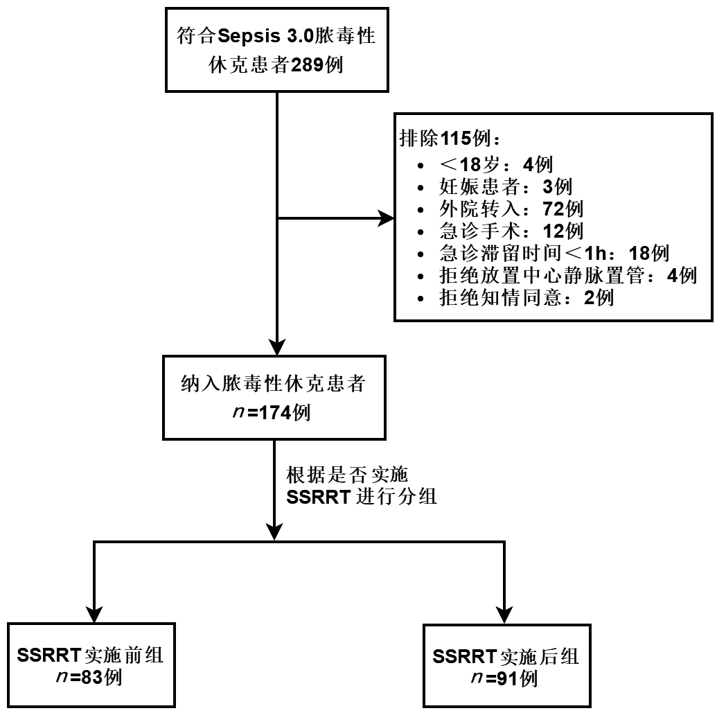 1 资料与方法 1.1 研究对象本研究对象为SSRRT建立前后南京医科大学附属淮安第一医院急诊脓毒性休克患者。纳入标准:符合拯救脓毒症运动国际指南脓毒症3.0(Sepsis 3.0)脓毒性休克诊断标准[8]。排除标准:①年龄 < 18岁;②妊娠患者;③外院转入已接受液体复苏和(或)血管活性药物患者;④需急诊手术者;⑤急诊滞留时间 < 1 h者;⑥拒绝放置中心静脉置管或有置管禁忌证患者;⑦拒绝签署知情同意。
