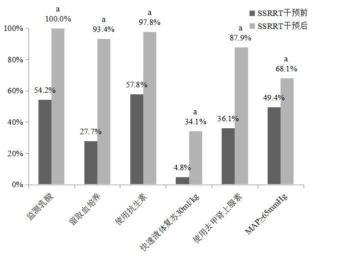 与SSRRT实施前比较,aP<0.05 图 3 SSRRT实施前后1 h集束化治疗策略实施情况比较 Fig 3 Comparison of the implementation of Hour-1 bundle therapy strategies before and after SSRRT implementation |
