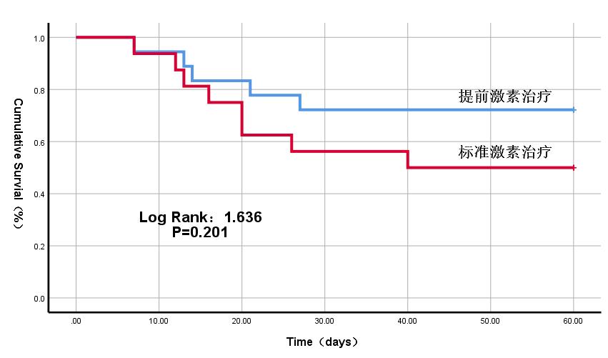 图 1 提前激素治疗对患者60 d生存率的生存曲线分析 Fig 1 Kaplan-Meier curves analysis of 60-day survival of patients treated with advance hormone therapy |