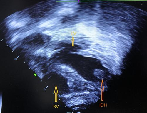 IDH为心肌内解剖血肿,LV为左心室,RV为右心室 图 1 患者第6日超声心动图 |