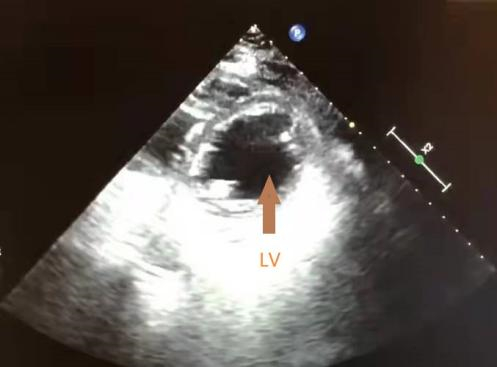 初步诊断患者为休克、心包积液、肺部感染、代谢性酸中毒。为解除心包压塞,于6月27日在血管造影下行心包穿刺引流术,引流量为220 mL,接引流袋(后持续引流出50 mL积血),术后超声心动图提示心功能正常。第2日患者胸闷症状好转,仍有心前区疼痛,给予地佐辛镇痛; 接下来的三日内患者心前区疼痛较前好转,超声心动图提示无明显心包积液,但出现持续性的发热,持续给予碳青霉烯类抗生素抗感染治疗。第6日复查超声心动图提示左室室间隔近心尖处有一液性暗区,并随心动周期晃动(图 1),大小约为1.5 cm×1.0 cm,左心室射血分数为70%,患者神志清楚,无胸闷呼吸困难,偶有心前区疼痛,无血流动力学异常,故未予以任何特殊治疗。第8日超声心动图示液性暗区仍然存在但范围缩小,大小约为1.1 cm×0.7 cm,患者胸痛症状较前缓解,血流动力学仍无异常,故仍未给予治疗,并转至急诊内科普通病房继续治疗。第11日超声心动图提示液性暗区消失(图 2)。第16日患者神志清楚,无胸闷胸痛,心肺听诊无明显异常,遂出院。至2021年12月,经过5个月的随访患者无心功能不全的表现,预后良好。