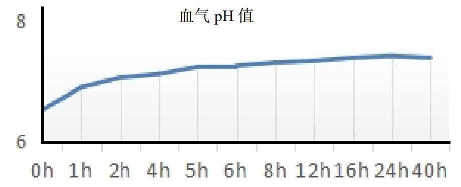患者进入急诊ICU后出现了罕见的“冷酸凝”症状-创伤死亡三联症:自发性极低体温31℃; 血气分析示严重代谢酸中毒:pH 6.52,碱剩余-43.9 mmol/L,乳酸33 mmol/L,PaO2 289 mmHg; 凝血功能异常活化部分凝血活酶时间 > 180 s,纤维蛋白原1.69 g/L。血钾6.1 mmol/L,血肌酐178 μmol/L,血肌钙蛋白0.27 ng/mL。患者循环极度不稳,需要大剂量去甲肾上腺素[0.78 μg/(kg·h)]维持,并出现无尿及肾功能衰竭。本团队立即予锁骨下深静脉穿刺、脉波指示连续心排血量监测置管(pulse-indicated continuous cardiac output,PICCO)、血透管置管(5 min内多人同时操作完成),并在10 min内开始连续肾脏替代疗法(continuous renal replacement therapy,CRRT)治疗:CVVHDF模式,血流速度150 mL/min,置换液1 500 mL/h,透析液1 500 mL/h,外周静脉碳酸氢钠速度200 mL/h,脱水速度300 mL/h(根据容量变化调节); 并联合鼓风机进行复温; PICCO监测,脑氧监测,床边超声监测同时动态监测患者循环及脑部情况,进行精准液体复苏; 床边心脏超声提示心脏射血分数30%左右,启动ECMO流程(床边备用)。患者入院后呼吸机参数设置为:容量控制(潮气量420 mL,呼吸频率18次/min,呼气末正压),维持指脉氧饱和度波动在94%~97%,氧合指数247。使用丙泊酚[0.3 mg/(kg·h)]及瑞芬太尼[0.7 μg/(kg·h)]联合镇静镇痛。给予床边纤支镜检查,主气道内吸出了大量食物残渣,并留取痰标本。经过以上综合治疗约12 h,患者的生命体征逐渐开始稳定,循环仅需要小剂量去甲肾上腺素[0.11 μg/(kg·h)]以及多巴酚丁胺[8.2 μg/(kg·h)]维持,床边心脏超声射血分数30%~35%;体温缓慢上升到了35 ℃, 乳酸下降到10 mmol/L,凝血功能异常基本纠正; 患者的瞳孔,由7 mm缩小至4 mm,光反射迟钝。治疗后24 h,患者出现了自主呼吸以及疼痛刺激,乳酸和pH水平下降到正常(图 1、2); 48 h后患者停用血管活性药物,逐渐开始复温至36℃; GCS评分上升到4+T+5,并有遵嘱动作。由于患者有心脏基础疾病(二尖瓣重度狭窄换瓣术后,慢性心功能不全),本团队治疗过程中在超声及PICCO等监测下进行了严格的容量管理,以及治疗后期气道管理及静脉血栓形成预防策略; 早期进行了肠内营养(3 d达到患者热卡目标)。入院后5 d进行气管切开,一周后患者脱离呼吸机,肾功能恢复正常,神志完全转清,顺利转入康复科治疗。