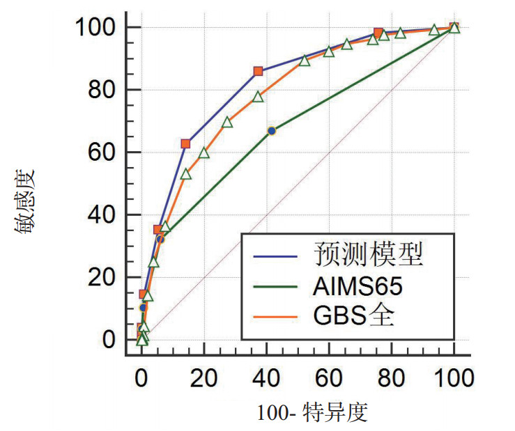图 1 预测模型与GBS, AIMS65的ROC曲线 Fig 1 ROC curve of the predictive model, GBS and AIMS65 |