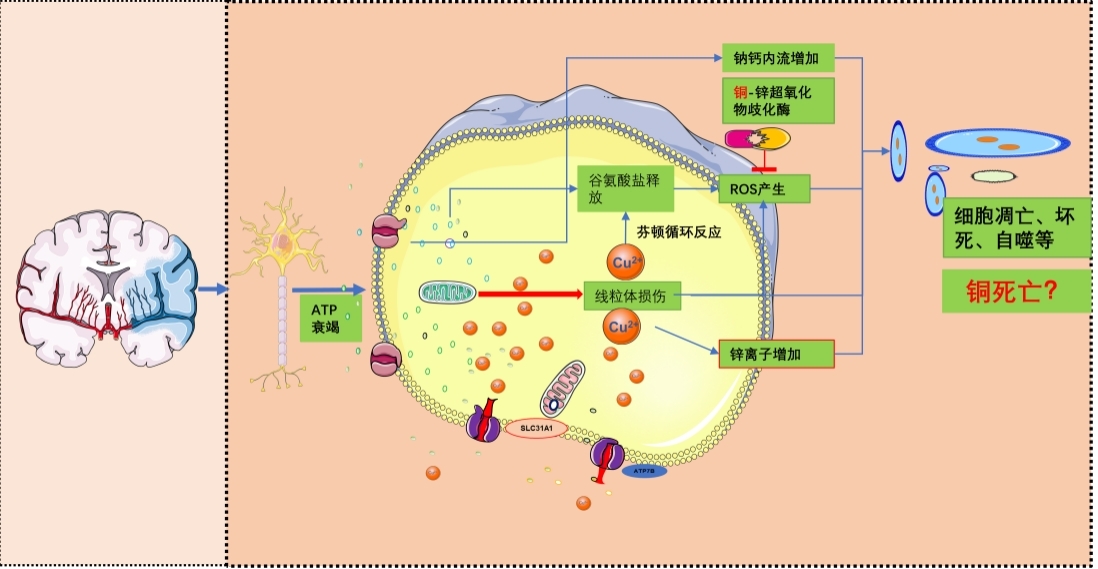 铜稳态对于器官和细胞的正常代谢具有重要作用。铜是许多脑细胞正常代谢关键过程和神经递质形成的关键成分[11-12],在慢性神经退行性变和中风等急性脑部疾病中,铜的稳态常处于失衡状态[13]。已证实在阿尔兹海默症、帕金森病、肌萎缩侧索硬化(Amyotrophic lateral sclerosis, ALS)等退行性神经疾病中,动脉斑块内夹杂的过量铜能与聚集的蛋白质相互作用,参与细胞氧化应激导致神经细胞的坏死[14]。门克斯病和枕角综合征(Menkes disease and occipital horn syndrome, Menkes OHS) 是X常染色体易位,Menkes/OHS基因突变,导致铜转运P型(Adenosine triphosphate, ATP) 酶失活[15],此外铜的细胞毒性直接作用于威尔逊病的发生发展[16-17]。铜还可以通过与谷胱甘肽、半胱氨酸、抗坏血酸等物质进行芬顿循环反应(Fenton reaction cycling)形成活性氧[18-20],诱导Caspase-8表达上调加速细胞凋亡[21]。最近的研究发现细胞内的铜离子累积是导致细胞铜死亡的前提[10];生理情况下,外源性铜离子通过人铜离子转运体1 (hCTR1)、铜蓝蛋白、二价金属离子转运体(DMT1)等载体运输进入肠黏膜细胞,然后由铜转运蛋白ATP7A等从肠黏膜细胞跨膜转运至门静脉血循环[22-23]。肝脏是主要摄取细胞外铜离子的组织,铜离子与超氧化物歧化酶铜伴侣蛋白(CCS)和抗氧化蛋白1(Human antioxidant protein 1, ATOX1)以及细胞色素氧化酶17(COX17)等铜伴侣蛋白结合后被运到细胞内不同细胞器中,维持细胞的正常功能[25];铜泵(Cu+-ATPase)将胞内过剩的铜离子以依赖ATP的方式排出胞外[25]。卒中发生后几分钟脑细胞就出现出缺血缺氧,导致ATP产量显著下降,使得铜转运受限[26];铜靶向性输送已被证实能预防退行性神经病变及缓解缺血性脑卒中的神经元损伤[27]。在卒中时,胞内的铜离子摄取及排除稳态会因ATP产生受限而失衡,铜离子在细胞内的累积有可能会导致细胞铜死亡的发生。