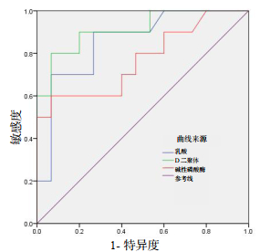 将多因素Logistic回归分析下具有统计学意义的因素(ADL评分、QTc间期、乳酸、凝血酶原时间、D二聚体、间接胆红素、碱性磷酸酶)作ROC曲线描绘,其中D二聚体、乳酸、碱性磷酸酶对秋水仙碱中毒预后具有预测价值,其截断值分别是8.965 mg/L、4.05 mmol/L、230.5 U/L。见表 4,图 1。
