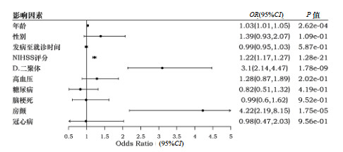采用多因素logistic回归分析,基线较高的NIHSS评分(OR=1.22,95%CI: 1.17~1.27)和D-二聚体值升高(OR=3.1,95%CI: 2.14~4.47)以及房颤(OR=4.22,95%CI: 2.19~8.15)是大血管闭塞的独立危险因素。(图 1)