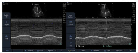 A:吸气末膈肌厚度;B:呼气末膈肌厚度 图 2 膈肌厚度 Fig 2 Diaphragm thickness |
