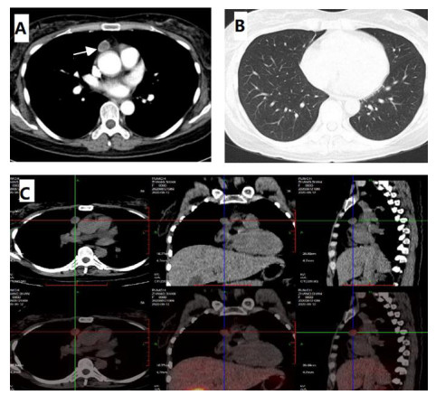 A:纵隔窗白色箭头提示前纵隔占位1.8×1.6cm;B:肺窗未提示感染感染;C:99mTc-HTOC:前纵隔结节,生长抑素受体高表达灶 图 1 8-13胸部增强CT |