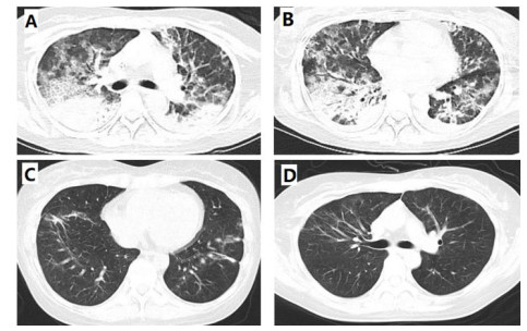 图 2 9-4 A、B双肺间质弥漫性渗出伴炎性改变,双下肺实变影9-16 C、D治疗后复查双肺炎性改变较前明显改善 |