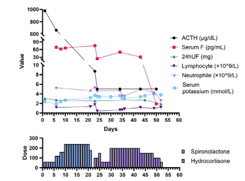 图 3 血促肾上腺皮质激素(ACTH)、血总皮质醇(serum F)、24 h尿皮质醇(24UF)、淋巴细胞绝对值(lymphocyte)、中性粒细胞绝对值(neutrophile)、血清钾离子水平(serum potassium)趋势及螺内酯(spironolactone)、氢化可的松(hydrocortisone)的用量关系图 |