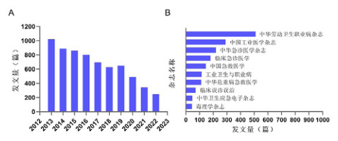 2 我国急性中毒的研究成果 2.1 发文数量及研究质量笔者基于中国知网文献检索平台,以“急性中毒”为主题词进行检索,对发表于2013年1月至2022年12月期间有关急性中毒的文献进行统计分析,由于存在数据库的选择偏倚,可能会对收录在其他数据库中的文献有所疏漏。在中国知网共计检索到有关急性中毒的研究文献6600余篇,年发文量呈现逐渐下降的趋势(见图 1A);同时也对急性中毒专业影响力较高的十种权威期刊十年内有关急性中毒文献的发文数量进行统计(见图 1B)。目前我国急性中毒领域的研究热点主要围绕有机磷中毒、一氧化碳中毒、酒精中毒、百草枯中毒、职业暴露中毒和药物中毒,因误服、过量或滥用导致的药物中毒(包含镇静安眠药、抗精神病药、解热镇痛药和中草药等)相关研究逐年增多,元素中毒(比如铅、铊、汞、铜、砷等)的研究具有散发性,毒蘑菇中毒、蜂螫伤、蛇咬伤和毒品中毒等研究具有地域性。