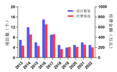 2.2 国自然基金获批情况国家自然科学基金委员会是我国支持基础研究的重要机构之一,急性中毒作为急诊常见病,也是基金委资助的一个重要方向。笔者以“中毒”为项目关键词,检索、筛选并分析了批准年度为2013年1月至2022年12月期间有关人类急性中毒领域研究项目的资助情况。十年间,基金委共资助急性中毒相关研究项目74项,累计资助经费3052万元。其中,面上项目36项(48.6%),总金额2 073万元(67.1%);青年科学基金项目24项(32.4%),总金额571万元(18.5%);地区科学基金12项(16.2%),总金额426万元(13.8%)。2016年是我国急性中毒国自然基金获批项目最多的一个年份,2016年之后呈现下降趋势,2018—2022年获批项目数量和经费金额均趋于稳定(见图 3)。急性中毒领域获批的国家自然科学基金资助项目有百草枯中毒、一氧化碳中毒、有机磷中毒、毒蘑菇中毒、元素中毒、氧中毒和硫化氢中毒等。十年来,国家自然科学基金委员会对中毒领域的持续支持,有力地推动了急性中毒研究的发展和人才培养,但相比其他优势学科,急性中毒领域的项目资助规模还有很大上升空间。
