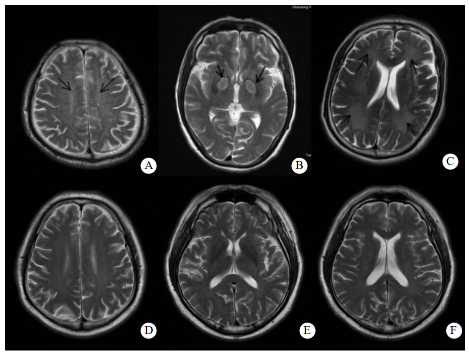 在ACOP纳入排除标准的基础上,DEACMP纳入标准:(1)有假愈期;(2)假愈期后出现以痴呆、精神症状、肌张力增高和震颤麻痹为主的典型临床表现;(3)头颅MRI存在以半卵圆中心、苍白球、侧脑室周围白质为主要部位的对称性T2高信号改变。排除标准:假愈期内服用精神类药物。