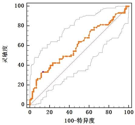 ROC分析结果显示,ROC曲线下面积为0.603(95CI: 0.513~0.694),且差异有统计学意义(P=0.028),见图 1,表明RS/QRS时间对肺栓塞的发生具有一定的预测作用。预测截断值为0.6925,敏感度为33.3%(25/75),特异度为87.0%(67/77),阳性预测值为71.4%(67/117),阴性预测值为57.3%(25/35)。