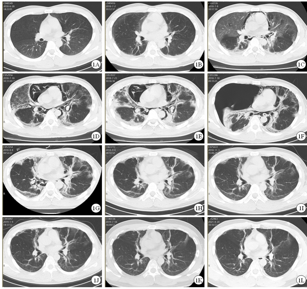 治疗效果:患者治疗过程中给予持续心电监护、血氧饱和度监测、血压监测、记出入量,动态监测肝肾功能变化(表 1)。入院12 h后尿液中PQ含量降至10~30 mg/L,入院18 h后尿液中PQ含量降至0~3 mg/L。入院第2天出现口腔黏膜充血,咽部疼痛,血肌酐升高,PaCO2: 35mmHg,PaO2:115 mmHg,Lac: 3.9 mmol/L;第3天出现顽固性呃逆,间断予以氯丙嗪肌肉注射,PaO2: 103 mmHg,Lac: 4.5 mmol/L,胸部CT:双肺下叶条索灶(图 1A);第5天口咽黏膜糜烂疼痛加重,全身皮肤黏膜黄染,肝功能相关指标明显升高,PaO2: 92 mmHg,Lac: 1.5 mmol/L;第7天未再出现呃逆,PaO2: 90 mmHg,Lac: 1.4 mmol/L,胸部CT:双肺间质性改变,双侧胸腔积液(图 1B);第12天肾功能相关指标恢复正常,肝功能相关指标开始好转,PaO2: 63 mmHg;第13天胸部CT:纵隔、颈部及胸壁气肿,双肺间质纤维化范围较前增大,双侧胸腔少量积液(图 1C);第23天口咽部疼痛明显减轻,PaO2: 74 mmHg,胸部CT:纵隔气肿及皮下气肿较前加重,双肺间质弥漫磨玻璃样影及条索状高密度灶较前密度增高,肺组织较前膨胀不全,双侧胸腔仍见少量积液(图 1D);第28天胸部CT示纵隔气肿及皮下气肿、双肺间质性肺炎并纤维化、肺组织膨胀不全较前较前持续加重(图 1E);第31天肝功能相关指标恢复正常;第35天患者突发胸闷憋气,胸部CT示右侧大量气胸、纵隔偏移(图 1F),急症行胸腔闭式引流术后,症状缓解;第42天PaO2: 87 mmHg,胸部CT示右侧胸膜腔及纵隔内气体较前明显减少,双肺间质弥漫磨玻璃样影及条索状、斑片状高密度灶较前减轻(图 1G);第44天出院。服毒半年后,患者自述无胸闷、憋气、胸痛等不适,步行上五楼无明显气促症状,PaO2: 76 mmHg,胸部CT:双肺间质弥漫磨玻璃样影及条索状、斑片状高密度灶,范围较前缩小,边缘较前清晰(图 1J)。服毒1年后,患者可从事正常体力劳动,PaO2: 91 mmHg,胸部CT: 双肺野内示多发纤维条索灶,胸膜下线形成,肺纤维化复查好转CT表现(图 1K)。服毒3年后,患者已从事正常体力劳动,PaCO2: 39 mmHg,PaO2: 82 mmHg,胸部CT:双肺野内示多发纤维条索灶,胸膜下线形成,较前未见明显变化(图 1L)。