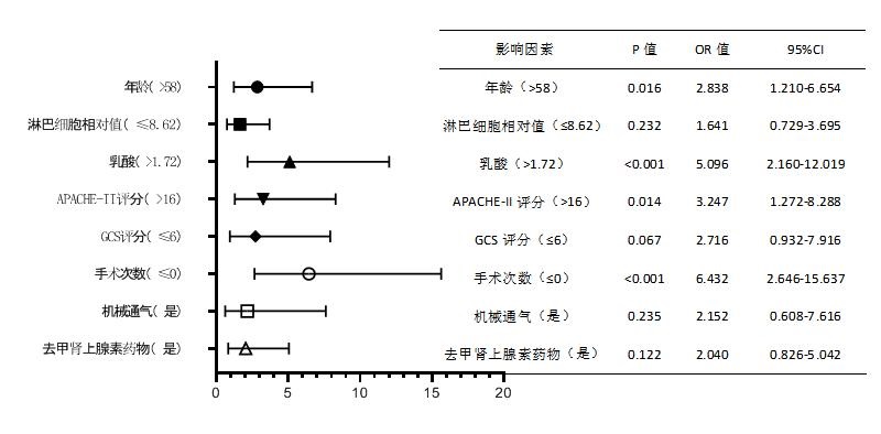 以患者年龄(>58岁= 1,≤58岁= 0),淋巴细胞相对值(≤8.62%=1,>8.62%=0),乳酸(>1.72 mmol/L=1,≤1.72 mmol/L=0),APACHE Ⅱ评分(>16=1,≤16=0),GCS评分(≤6=1,>6=0),手术次数(≤0次=1,>0次=0),机械通气(是=1,否=0),去甲肾上腺素药物应用(是=1,否=0)为自变量进行Logistic回归分析,以P < 0.05代表差异具有统计学意义,其中患者年龄(P=0.016)、乳酸(P < 0.001)、APACHE Ⅱ评分(P=0.014)、手术次数(P < 0.001)为预测多发伤患者预后病情恶化的独立危险因素,年龄(> 58岁)OR值=2.838,乳酸(> 1.72 mmol/L)OR值=5.096,APACHE Ⅱ评分(> 16分)OR值=3.247,手术次数(≤0次)OR值=6.432。并建立森林图。见表 2、表 3及图 1。