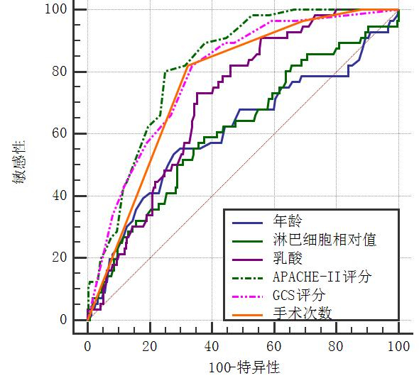 对于因变量预测病情恶化的发生,单因素有意义的因素:年龄、是否应用去甲肾上腺素药物,是否接受了机械通气治疗,入院后根据病情需要连续测得的5次淋巴细胞相对值、乳酸的平均值,入院24 h的APACHE Ⅱ评分、GCS评分及住院期间手术次数再次进行二元Logistic回归模型(Enter法)得出独立影响因素,模型拟合时以α入=0.05、α出=0.10对变量进行纳入和剔除标准;将单因素进行赋值,以患者救治结局(恶化= 1,好转= 0) 为因变量。