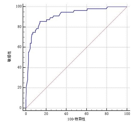 将二元Logistic回归分析中的影响因素:年龄、是否应用去甲肾上腺素药物,是否接受了机械通气治疗,入院后根据病情需要连续测得的5次淋巴细胞相对值、乳酸的平均值,入院24 h的APACHE Ⅱ评分、GCS评分及住院期间手术次数联合起来再次进行ROC曲线验证,得到AUC=0.912, 95%CI 0.873~0.942;P<0.001),联合起来的ROC曲线下面积大于独立的预后影响因素的ROC曲线下面积,更好的说明这些因素联合后对多发伤患者预后预测病情恶化更有意义。见表 5及图 3。