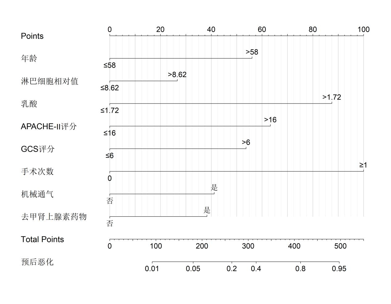 1.5 统计学方法采用软件SPSS26.0对数据进行统计分析,计量资料不服从正态分布以[M(Q1, Q3)]来表示,两组间比较采用两独立Mann-Whitney U秩和检验来比较组间差异;计数资料以(n, %)来表示,采用χ2检验来比较组间差异,对于因变量结局恶化发生,单因素有意义的因素再次进行二元Logistic回归模型(Enter法)得出独立影响因素,模型拟合时以α入=0.05、α出=0.10对变量进行纳入和剔除标准;采用Medcalc软件对年龄、淋巴细胞相对值、乳酸、APACEⅡ、GCS、手术次数预测预后进行ROC曲线分析,得出各个指标诊断效能与截断值;采用R软件对二元Logistic回归模型中的影响因素预测病情预后,并建立列线图预测模型;均为双侧检验,以P < 0.05代表差异具有统计学意义。