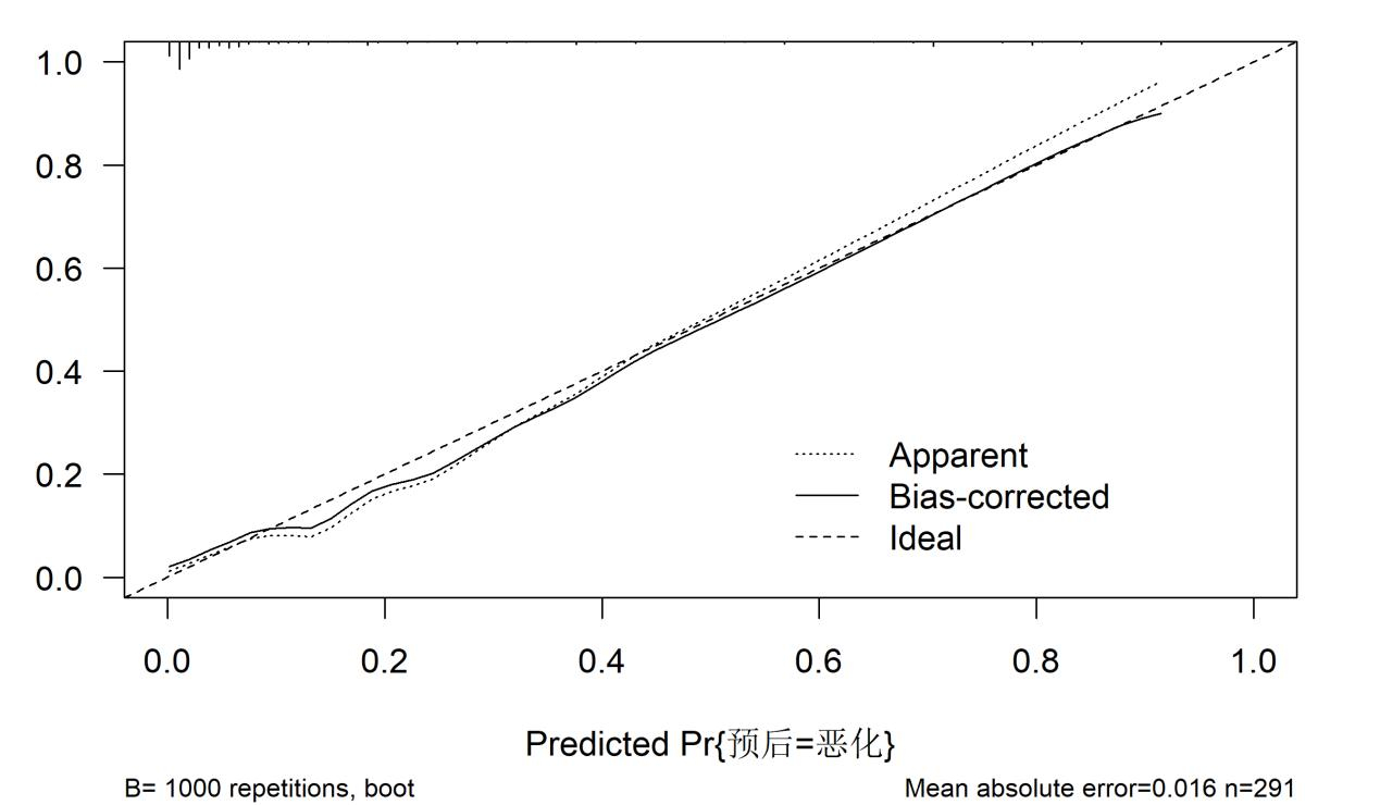 采用R软件对二元Logistic回归模型中的影响因素预测病情是否发生恶化进行列线图模型建立,并进行校正,模型具有良好的拟合校准曲线。综合多种因素,计算其总评分,对多发伤患者预后病情恶化的概率进行预测。见图 4,图 5。