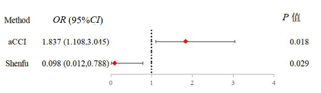 图 3 aCCI和参附注射液的使用对老年脓毒性休克患者生存预后的评估 Fig 3 Evaluation of survival of elderly patients with septic shock by aCCI and Shenfu injection |