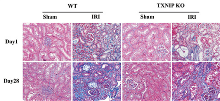 图 2 Masson染色显示,IRI后第1天,IRI组和IRI+TXNIP KO组小鼠肾小球周围和肾间质可见明显蓝染的纤维化成分和炎症细胞浸润,肾小管坏死、萎缩。IRI组小鼠肾组织纤维化和炎症细胞浸润均明显强于IRI+TXNIP KO组。IRI组和IRI+TXNIP KO组第28天,肾间质纤维化范围较第1天继续增加,但IRI+TXNIP KO组纤维化范围小于IRI组。
