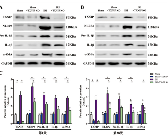 综上所述,本研究证实了抑制TXNIP显著减轻IRI,抑制AKI向CKD转变,其机制可能是通过抑制NLRP3通路持续激活,降低了全身和肾脏局部炎症因子水平,减轻α-SMA等纤维化成分在肾间质蓄积。