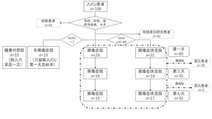 1 资料与方法 1.1 一般资料本研究为前瞻性队列研究,纳入2018年6月至2018年12月入住宁夏医科大学总医院ICU的脓毒症和脓毒症休克患者为研究对象,同期入住ICU的普通术后患者为非脓毒症组,并纳入年龄、性别与其他三组匹配的健康志愿者为健康对照组。脓毒症和脓毒症休克诊断标准采用“Sepsis-3.0”定义[4]。纳入标准:(1)年龄≥18周岁;(2)入住ICU 24 h内诊断为脓毒症。排除标准:(1)既往存在自身免疫性疾病的患者;(2)HIV感染者;(3)肿瘤患者;(4)妊娠及哺乳期女性;(5)长期接受糖皮质激素、免疫抑制剂及放疗、化疗的患者。