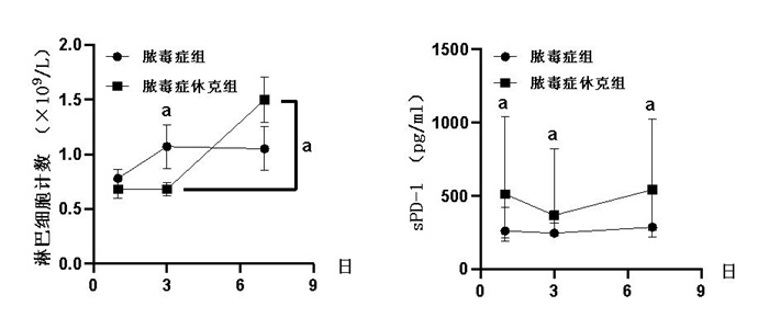 图 2 入ICU一周内脓毒症和脓毒症休克患者淋巴细胞计数和sPD-1动态变化 Fig 2 Lymphocyte count and sPD-1 dynamics in patients with sepsis and septic shock within 7 days of ICU admission |