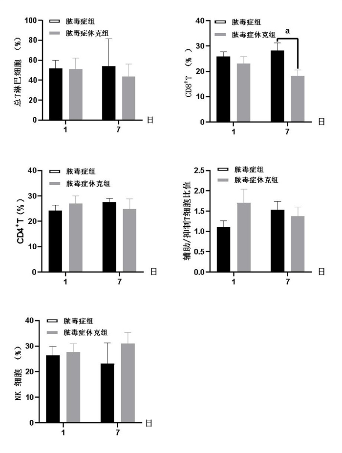 本研究还观察脓毒症和脓毒症休克患者入ICU一周内T淋巴细胞亚群的变化,发现入ICU第1天,脓毒症休克组辅助/抑制T细胞比值高于脓毒症组,入ICU第7天脓毒症休克组CD8+T淋巴细胞显著低于脓毒症组,其临床意义尚不明确。淋巴细胞总数减低的基础上,辅助T细胞比例更高,是否与脓毒症更高的炎症因子释放相关,需要进一步验证。而入ICU第7天CD8+T淋巴细胞降低,可能导致脓毒症休克患者后期细胞毒T细胞功能低下,吞噬细胞内病原体受抑制。一项对脓毒症患者的尸体解剖研究发现,脓毒症患者脾脏内的CD8+T淋巴细胞显著减少[20]。