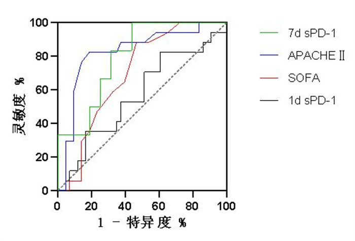 注:sPD-1为可溶性程序细胞死亡蛋白1,APACHE Ⅱ评分为急性生理学与慢性健康状况评分系统Ⅱ,SOFA评分为序贯器官衰竭评估系统 |