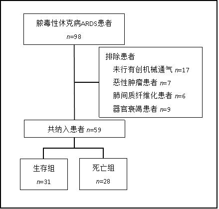 2 结果 2.1 一般临床资料共有98例患者符合脓毒性休克并ARDS诊断标准,本研究排除了17例未行有创机械通气患者、7例罹患恶性肿瘤患者、6例特发性肺间质纤维化患者以及9例入院时存在器官衰竭患者,最终纳入了59例患者(图 1),其中男性38例,女性21例,年龄(73.81±13.70)岁。根据28 d预后情况分为生存组31例,死亡组28例。生存组与死亡组间的性别、年龄、血培养阳性率、基础疾病情况、RICU住院时间以及入住RICU时的PCT、CRP、WBC、SCr、PLT、MAP、Tbil的差异无统计学意义(均P > 0.05)。死亡组的SOFA评分、APACHEⅡ评分显著高于生存组(P < 0.05)。见表 1。