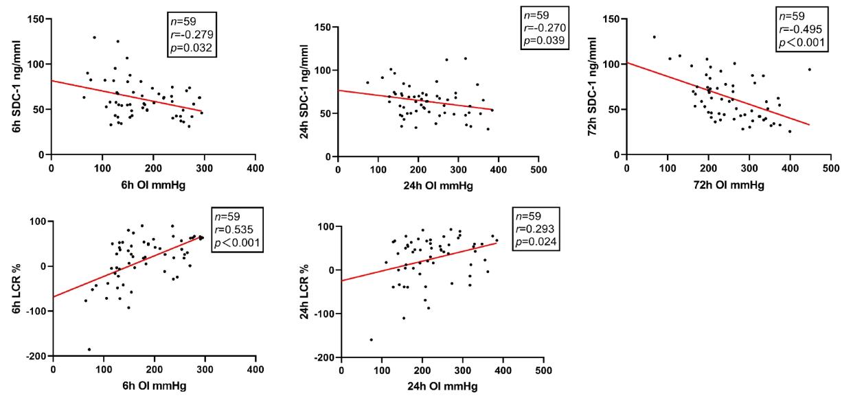 Spearman相关性分析显示6 h SDC-1(rs= -0.279)、24 h SDC-1(rs=-0.270)、72 h SDC-1(rs= -0.495)与对应时间点的OI均呈显著负相关(P < 0.05);6 h LCR(rs=0.535)、24 h LCR(rs=0.293)与对应时间点的OI均呈显著正相关(P < 0.05)。见图 2。