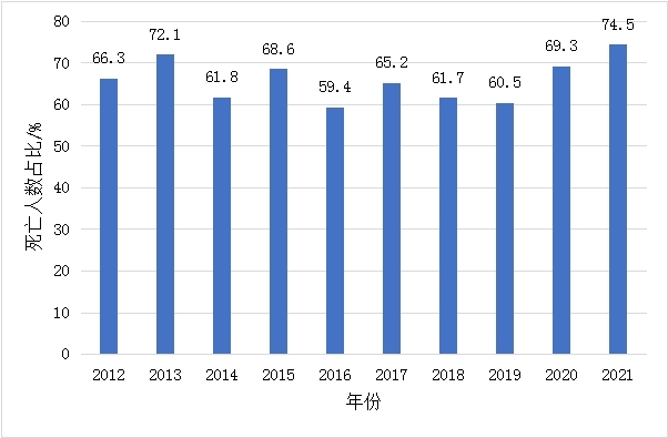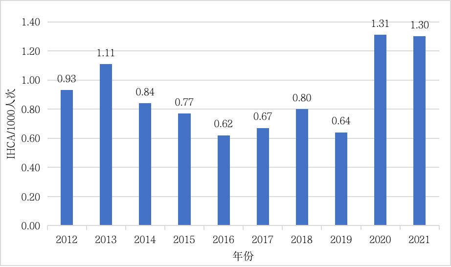 图 2 2012—2021年IHCA死亡人数占院内总死亡人数比例变化图 |