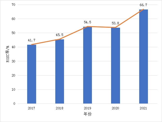 2017—2021年重症监护病房外IHCA患者ROSC率呈逐步升高趋势。见图 3。