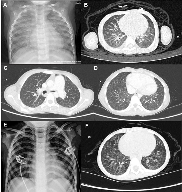 A:患儿1胸部X线片示两肺纹理增多增粗、片絮影;B:患儿1胸部HRCT示条絮影及网格样改变;C、D:患儿2胸部HRCT示两肺间质增厚、弥漫小片絮状磨玻璃影;E:患儿3胸部X线片示两肺片絮状密度增高;F:患儿3胸部HRCT示两肺弥漫性小斑片状、结节状密度增高 图 1 MAHCC合并呼吸衰竭患儿胸部影像学表现 |