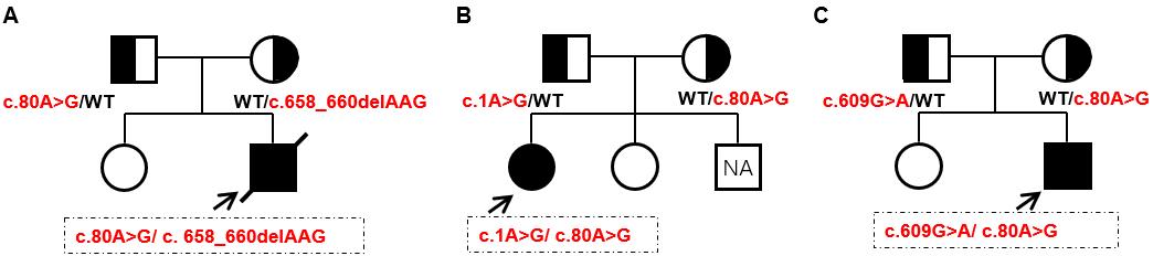 患儿均行全外显子组测序,发现MMACHC基因复合杂合变异,家系情况见图 2所示。3例患儿共携带4种变异:c.1A > G、c.80A > G、c.609G > A、c.658_660delAAG,均为既往已报道的变异。ACMG评级为致病性变异。