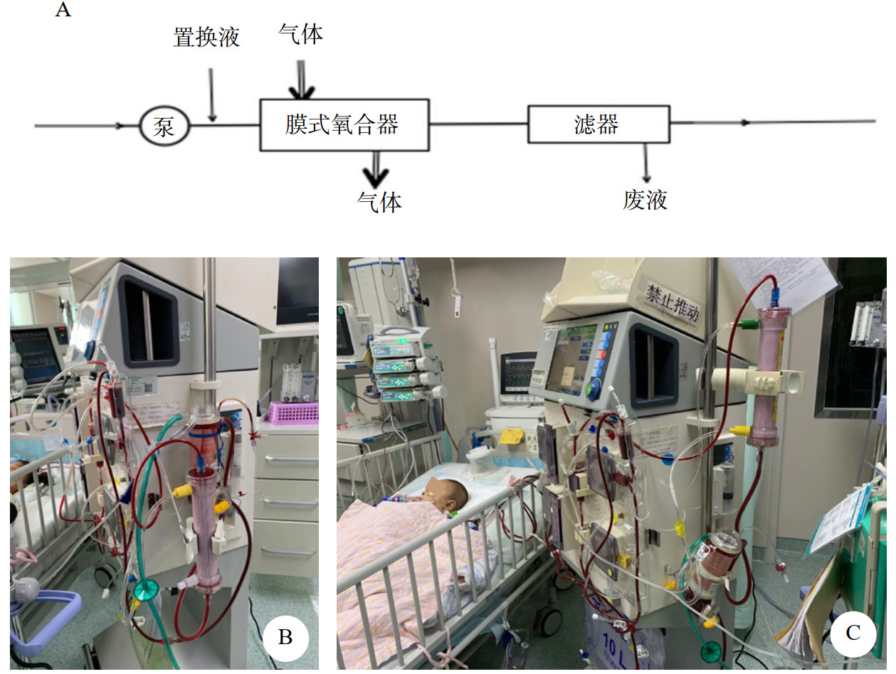 A:连接示意图,B、C:实际连接患儿的照片 图 1 CRRT联合ECCO2R连接方式示意图 Fig 1 Schematic diagram of the connection method of CRRT combined with ECCO2R |