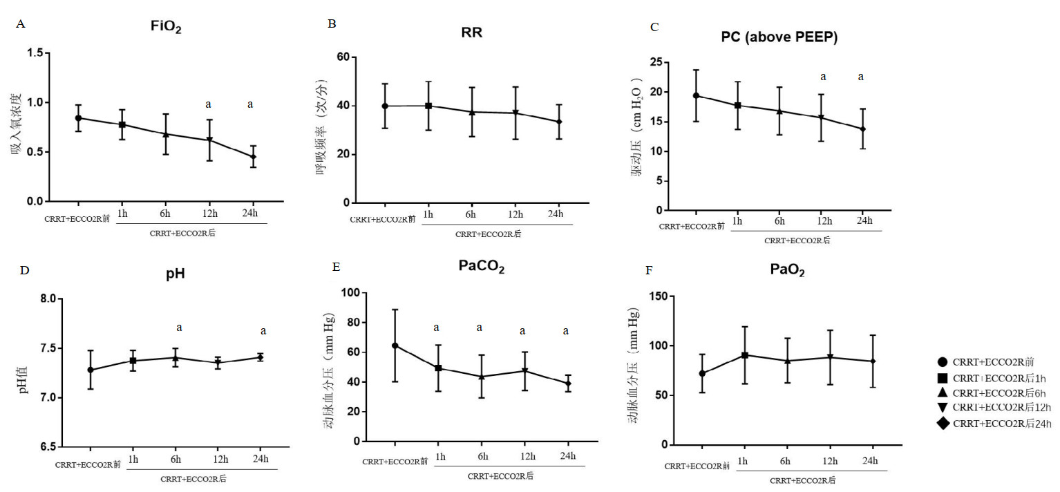 A~F图分别是CRRT+ECCO2R治疗前后FiO2、RR、PC、pH、PaCO2和PaO2的比较,aP < 0.05;1 cm H2O = 0.098 kPa 图 2 CRRT+ECCO2R治疗前后血气分析及呼吸机参数变化趋势 Fig 2 Trends of blood gas analysis and ventilator parameters before and after CRRT+ECCO2R treatment |